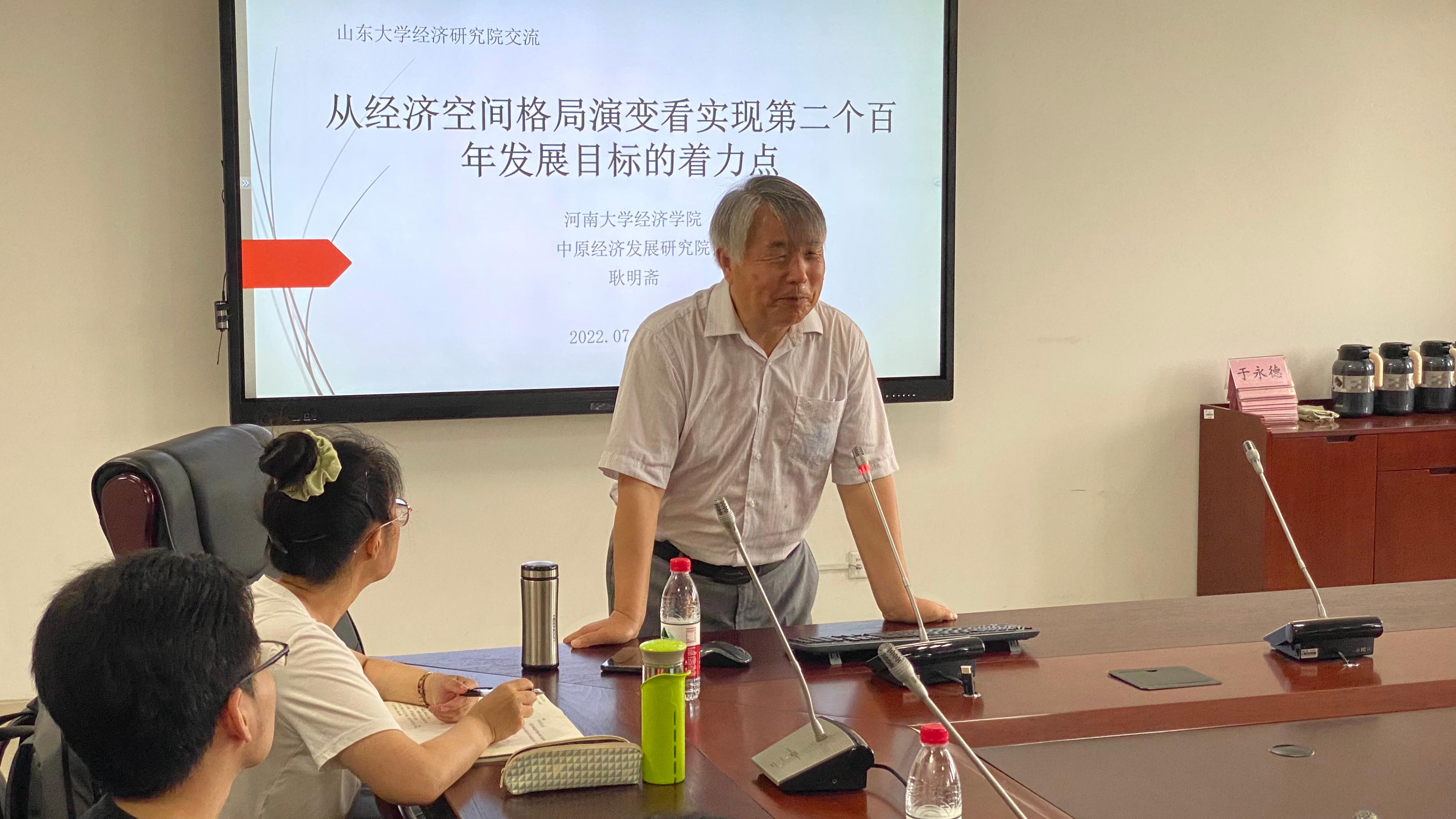 河南大学经济学院资深教授、原院长耿明斋教授作了题为“从经济空间格局演变看实现第二个百年发展目标的着力点”的主题报告。他强调山东与河南的地理和文化联系非常强,全面系统地介绍河南2008年以来经济发展的情况,并且与山东进行比较,分析各自的优势和劣势以及巨大的互补性,他强调:一是鲁豫两省合作的空间很大,也很有必要,要破除要素流动壁垒,加强基础设施建设,促进人员在区域间的自由流动;二是人的现代化水平是区域现代化水平的决定因素,未来要进一步改造人的价值判断和思维方式;鲁豫两省合作发展有利于遏制南北经济差距扩大和黄河流域平衡。