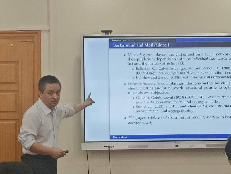 上海财经大学经济学院孟大文教授作了题为“Relative and Structural Network Interventions in Local Average Model”的报告。报告分析了局部平均设置下的网络博弈,其中参与者的收益取决于其所面对的社会规范。研究关注最优目标干预问题,其中规划者试图通过改变个体属性并且/或者在某些约束下重组底层网络来最大化其目标。报告首先讨论了相对特征干预问题,接着转向结构干预问题。研究发现,能否取得积极的效果取决于个体的从众心理以及对轻微损失的容忍程度。