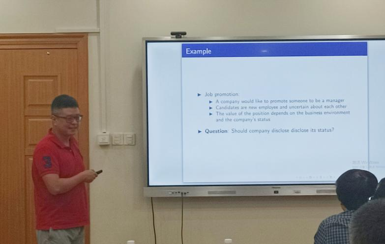 深圳大学经济学院副教授陈博作了题为“All-Pay Auctions with Affiliated Types and Values: Equilibria and Information Disclosure”的报告。报告讨论了具有附属类型和相互依存价值的全支付拍卖中的均衡和信息披露的问题。报告指出,企业的最优策略表现为“几乎完全披露”:它使投标人能够将范围缩小到最多三种状态,而真实状态就是其中之一。关键信息是,当且仅当投标人无法在事先分配下赚取任何租金时,组织者可以通过信息披露充分提取剩余。