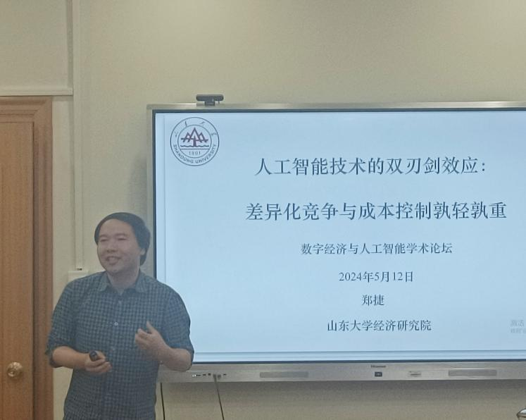 教授郑捷作了题为“人工智能技术的双刃剑效应:差异化竞争与成本控制孰轻孰重”的报告。通过综合考虑AI技术的使用对企业利润函数和消费者效用函数的影响,报告讨论了不完全竞争市场中的双寡头企业是否采用人工智能(AI)技术提供服务这一博弈问题,探讨AI的使用对企业成本控制与差异化竞争的影响,并开展全面的均衡刻画及社会福利分析。报告指出,企业面临AI技术造成产品的生产成本降低与横向差异减少这两者之间的权衡取舍,在数字经济成为国家重大发展战略的背景下为政府、企业与消费者的决策提供了新的理论依据。
