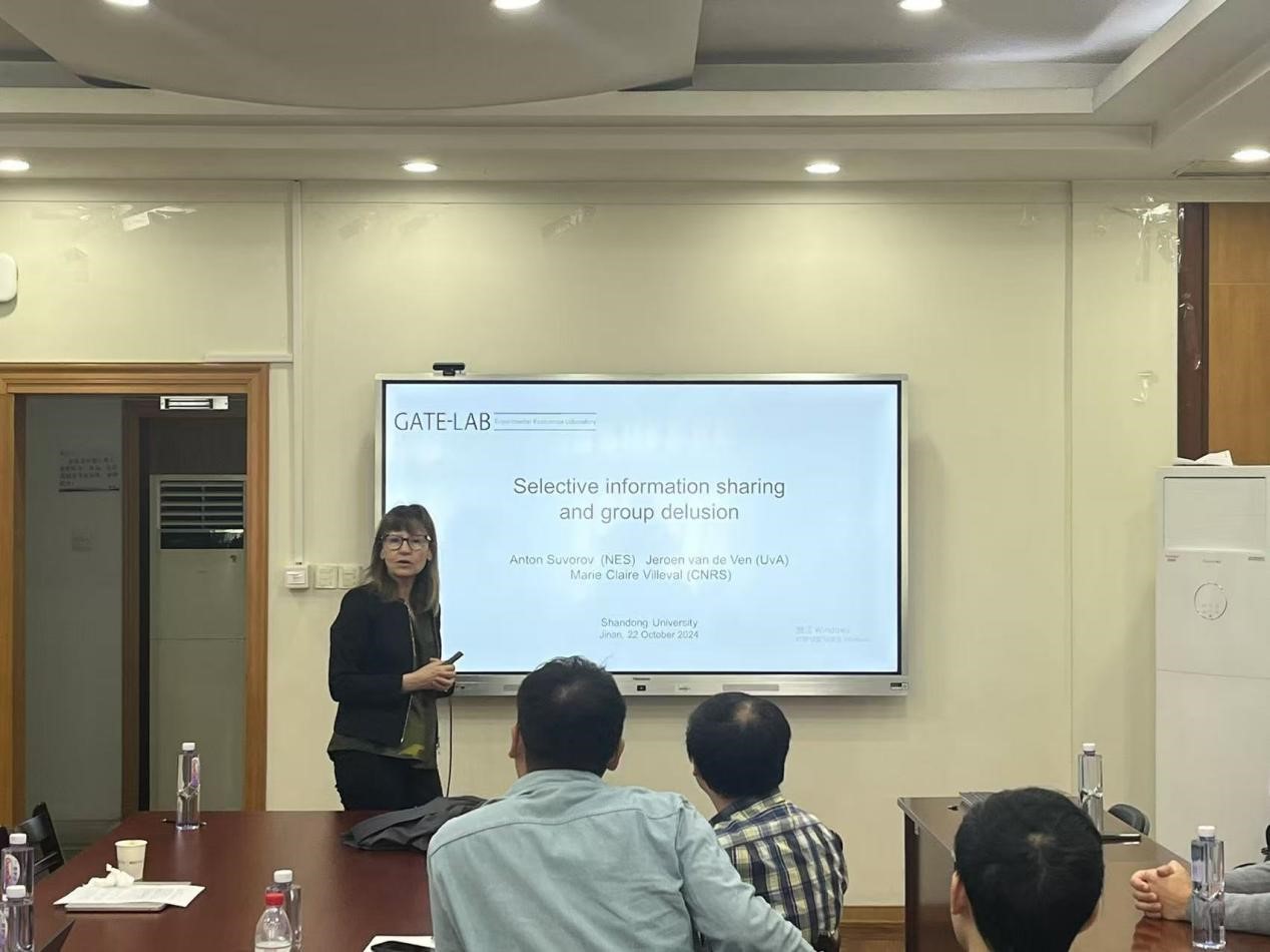 兼职讲席教授、欧洲科学院院士及国际经济科学学会前主席Marie Claire Villeval教授,围绕“Selective Information Sharing and Group Delusion”主题,进行了精彩的主旨演讲,深入探讨了信息分享与群体错觉的互动机制。