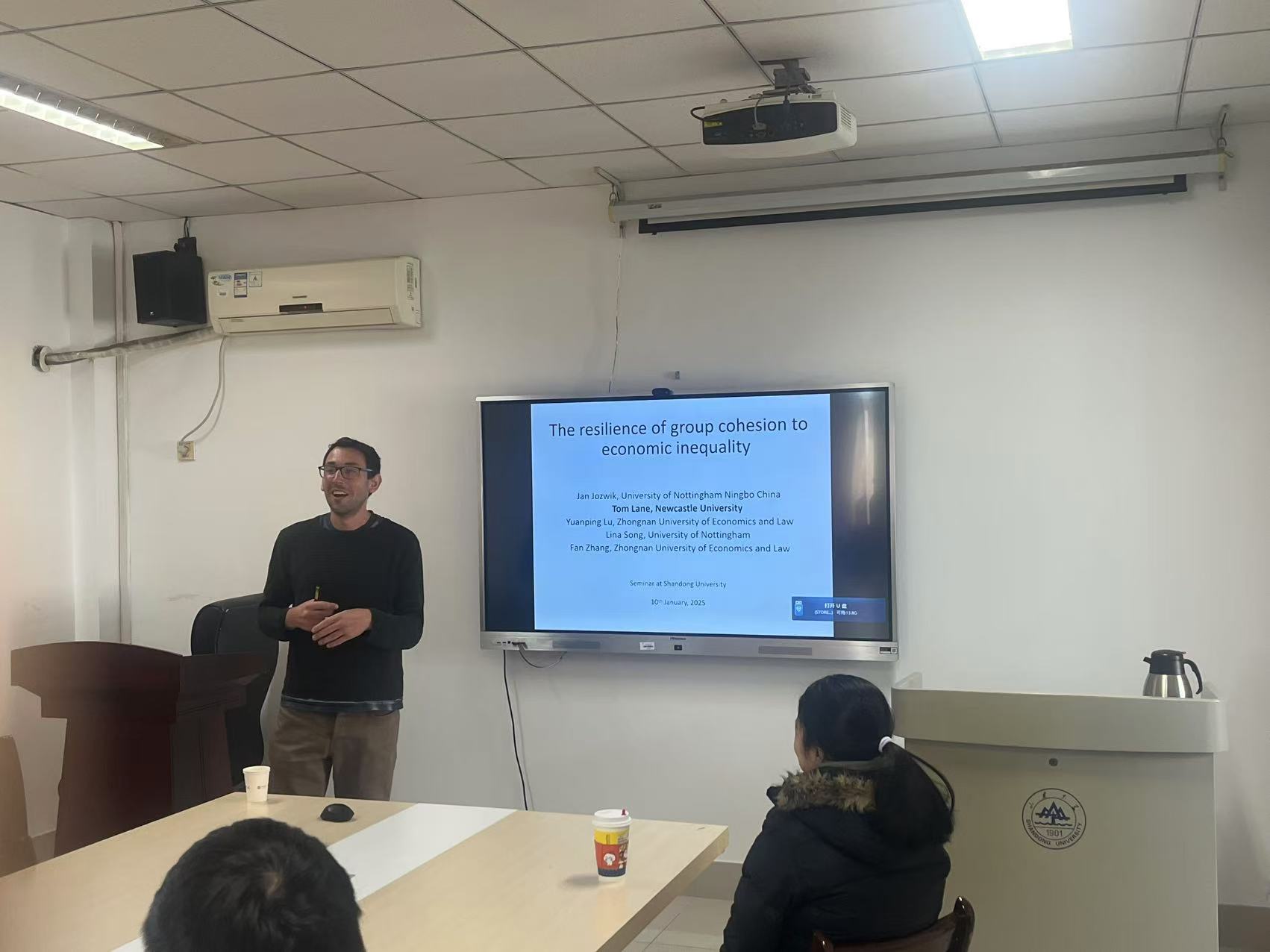 2025年1月10日,山大行为实验经济公开分享荟2025年第1期在邵逸夫科学馆501顺利进行,英国纽卡斯尔大学商学院高级讲师Tom Lane应邀做了题为“群体凝聚力对经济不平等的适应能力”的主题报告。痴女