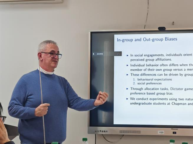 杜伦大学Jason Shachat教授在题为《Revealed and Hidden Social Preferences》的学术报告中,围绕不同群体互动中的社会偏好和行为差异展开深入探讨。报告基于专断博弈(Dictator Game,DG)和说谎专断博弈(Lying Dictator Game,LDG)的实验设计,以查普曼大学和武汉大学的本科生作为两个自然群体进行实验,LDG允许参与者谎报随机骰子结果,从而更真实地呈现社会偏好在隐性环境下的表现。研究发现:(1)在传统专断博弈(DG)中,两组学生均未表现出显著的群体内偏好,且分配分布无明显文化差异,支持“文化不变性”假说;(2)在说谎专断博弈(LDG)中,武汉学生表现出更高说谎比例,分配分布呈现出显著的文化差异,而查普曼学生行为接近随机分布;(3)两种博弈下的分配差异显著,表明形象关注对自私行为具有一定的抑制作用,但武汉学生在面对外部群体时表现出例外情况。通过进一步的混合模型分解分析,发现说谎者与非说谎者在偏好上无本质差异,揭示了跨文化情境下社会规范对机会主义行为的约束效应。