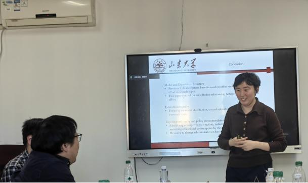 冷艾琳副研究员作了题为《Education Competition and Educational Equity: Theory and Experiment》的学术报告,围绕教育公平视角下的教育竞争问题展开探讨,重点分析货币投入与个体努力之间的替代关系。研究构建了一个兼顾货币投入与实际努力的Tullock竞赛模型,将初始财富差异、教育成本、学习难度等关键变量纳入模型框架,并通过实验室实验系统考察不同政策干预对教育公平的影响。实验结果表明,仅依靠降低教育成本难以有效缓解教育不平等;相比之下,适当降低考试难度并限制货币投入上限,能显著提升弱势群体获取教育机会的可能性。基于此结果,研究指出可通过为贫困学生提供财政补贴、限制高收费私立教育扩张等手段,抑制过度教育投入,优化教育资源分配结构,进而推动教育公平目标的实现。