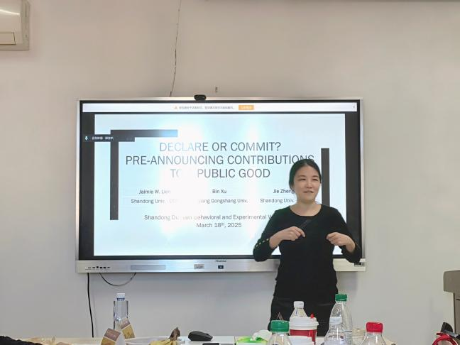 Jaimie W. Lien教授作了题为《Declare or Commit? Pre-Announcing Contributions to a Public Good》的学术报告,聚焦于公共物品博弈中声明与承诺对个体贡献行为的影响,特别强调个体层面与群体层面承诺机制的差异。实验设置包括五个组别:个体声明、群体声明、个体承诺、群体承诺以及一个无预告的对照组,以系统比较各机制对公共贡献行为的激励效果。研究结果表明,只有在群体承诺条件下,参与者的公共物品贡献水平显著提升,且这一正向效应在多轮博弈过程中不断增强。在该机制下,个体不仅履行了最低承诺水平,甚至在部分情形中超过原始承诺,逐步形成了稳定的正向贡献规范。相较之下,声明行为因缺乏约束力,属于空谈博弈(Cheap Talk),未能实质性提升贡献水平;个体承诺则由于对他人搭便车行为的担忧,其激励作用同样受限。研究指出,群体承诺机制通过强化成员间的信任与心理安全感,增强了群体内部对公共目标的持续性投入,这一机制为提升类似气候协议等国际公共合作中的执行效力提供了可行的行为策略与制度设计思路。