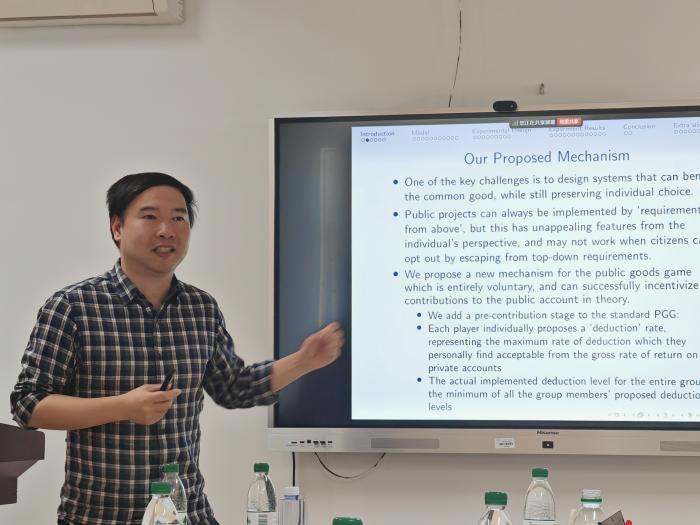 郑捷教授作了题为《With Great Deduction Comes Great Cooperation》的学术报告。郑捷教授在报告中提出了一种新的公共物品博弈机制,旨在通过自愿降低私人账户回报率以激励公共物品的完全贡献。该机制包含两个阶段:第一阶段,参与者提出自愿扣除率,第二阶段,根据群体中的最低扣除率分配资源。为深入分析该机制的有效性,实验设置了两种学习环境:一是外生给定的扣除率范例(Game X),二是由参与者自主决定的内生扣除率(Game N)。实验结果显示,接受外生扣除率示范的参与者在随后的内生决策阶段表现出更高的公共贡献意愿和资源配置效率。研究表明,借助降低外部机会吸引力且无需强制干预的机制设计,结合范例引导的学习效应,能够有效协调个体决策与集体利益,为公共合作难题的解决提供了有益的理论支撑与实践启示。