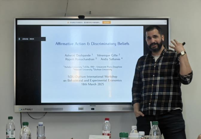 杜伦大学Andis Sofianos教授作了题为《Affirmative Action and Discriminatory Beliefs》的学术报告,探讨了印度种姓制度背景下平权行动(Affirmative Action, AA)对歧视性认知的潜在影响。Sofianos教授指出,印度种姓制度源远流长,传统上分为婆罗门、刹帝利、吠舍和首陀罗四大种姓,其中首陀罗中的“不可接触者”长期遭受社会排斥。印度独立后,政府在公务员录用与高等教育录取中为曾受压迫群体提供配额保障,确立了“预定种姓”(Scheduled Castes, SC)与“预定部落”(Scheduled Tribes, ST)制度。尽管如此,低种姓学生在高校仍普遍面临来自高种姓群体的歧视性对待,表现为回避、贬低和合作意愿降低等行为。研究通过实验手段发现,即使低种姓学生在学业表现等客观指标上与高种姓学生无异,平权受益者依然在能力评估和奖励分配中遭遇系统性偏见。此外,结果还表明,与基于种姓身份的平权措施相比,基于收入状况的平权行动更易获得公众接受;低收入身份在一定程度上可缓解对种姓平权受益者的污名化效应,但难以完全消除其所面临的歧视性认知。