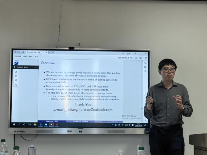山东大学经济学院刘津梁助理研究员作了题为《An Experimental Test of Strategy-Proofness and Simplicity Refinements in Elicitation Mechanisms》的学术报告。过往实验研究普遍发现个体在使用弱占优策略时存在系统性偏离,故经济理论基于此引入多种行为层面的机制改进以提升激励相容性与操作性。这一研究通过独特的实验设计将三类行为改进措施与各自紧密关联的“未经改进”基线机制进行对比,系统检验其在私人价值获取中的实际效果。具体而言,研究分别采用贝克尔–德格鲁普–马沙克机制(Becker–DeGroot–Marschak Mechanism,BDM)、动态降序多价格表(Multiple Price List,MPL)以及动态降序时钟机制(Dynamic Descending Clock mechanism)三种典型激励机制,分别对应简化支付函数(即逐个应急情境)、博弈结构的显著性、以及明显主导策略等行为理论特征展开实验测试。实验结果显示,MPL机制在获取个体真实价值方面的表现优于BDM与时钟机制,但整体来看,所有行为改进版本的机制在获取私人价值的准确性方面,并未显著优于其对应的原始基线机制。