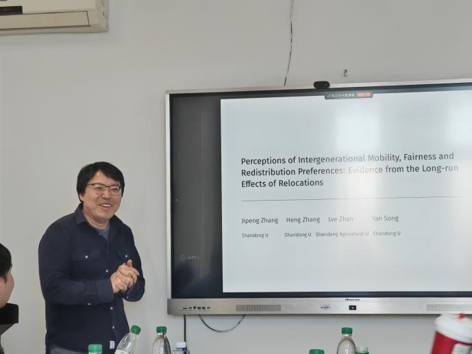 经济学院张吉鹏教授作了题为《Perceptions of Intergenerational Mobility, Fairness and Redistribution Preferences: Evidence from the Long-run Effects of Reallocations》的学术报告。张吉鹏教授基于中国山东省1994年扶贫搬迁项目所构成的准自然实验,系统研究了政府主导的人口搬迁政策对代际流动性感知、公平性感知与再分配偏好的长期影响。通过对搬迁实施30年后的427户搬迁家庭与563户非搬迁家庭进行混合调查,研究发现:第一,搬迁显著增强了个体对向上社会流动的乐观预期:搬迁者认为其后代跃升至最高收入阶层的概率提升了12.3个百分点,同时降低了对再分配政策的支持程度,偏好强度下降幅度为13至17.4个百分点,验证了“流动性感知抑制再分配需求”的理论机制。第二,异质性分析显示,低教育水平、低收入群体以及较年轻的搬迁者在流动性感知方面的提升更为显著,而女性与高收入搬迁者的再分配偏好下降幅度更大。第三,尽管搬迁显著影响了流动性认知,但对公平信念的作用并不显著,这是由于公平观的形成时点晚于搬迁干预,且个体成年后的城乡迁移趋同效应对其产生了调节作用。这一研究通过长期追踪调查与工具变量识别方法,提供了“激励型扶贫能够促进自足心态”的因果证据,对传统“福利依赖”假设提出挑战,并为优化搬迁政策设计与公共政策干预路径提供了重要启示。