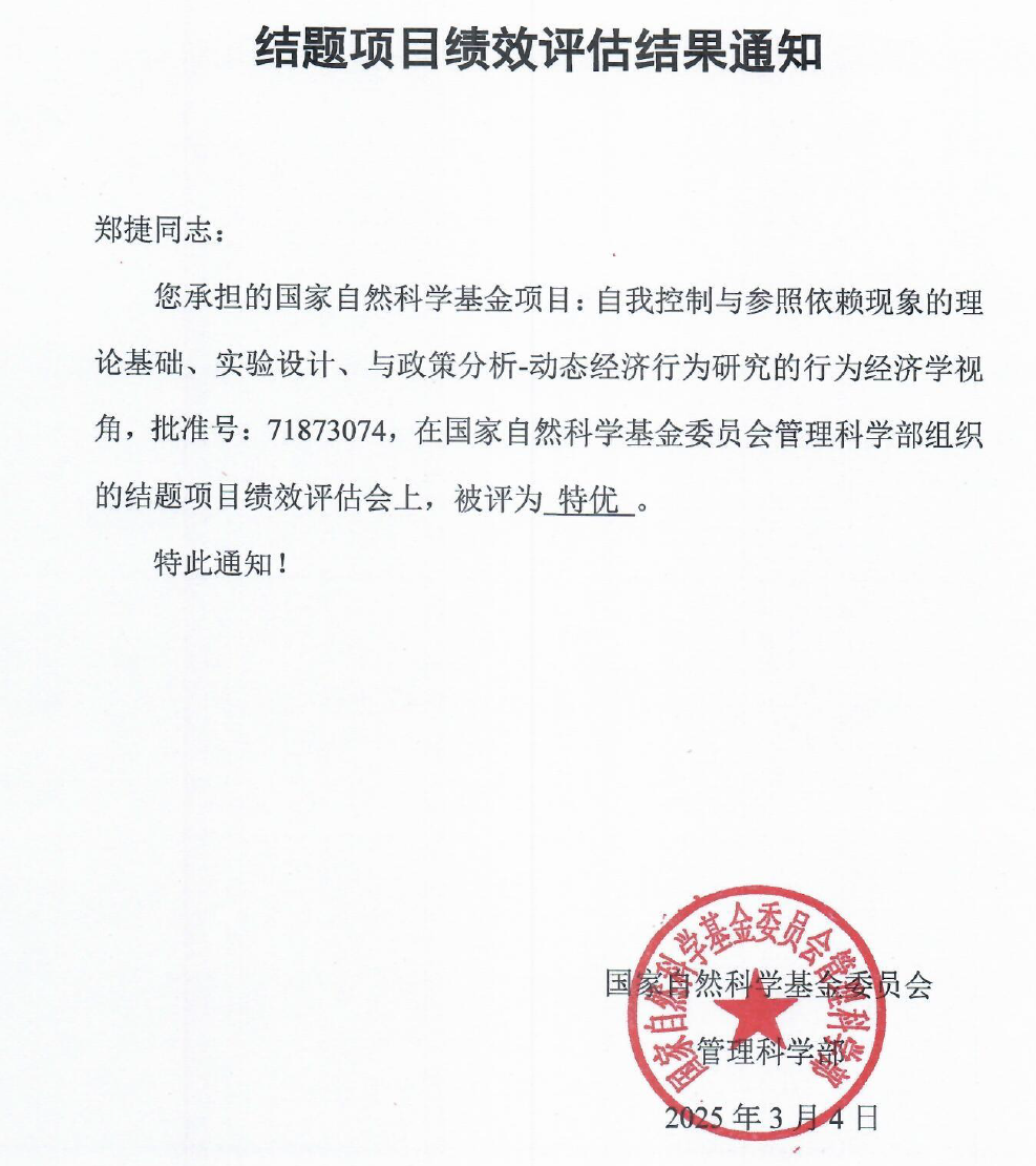 郑捷教授主持的面上项目“自我控制与参照依赖现象的理论基础、实验设计、与政策分析—动态经济行为研究的行为经济学视角”获评“特优”。