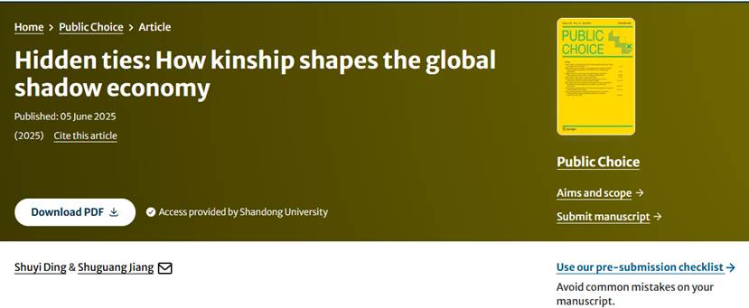 博士后丁书翼与姜树广教授合作完成的学术论文Hidden ties: How kinship shapes the global shadow economy在国际公共与政治经济学权威期刊Public Choice在线发表。这是痴女