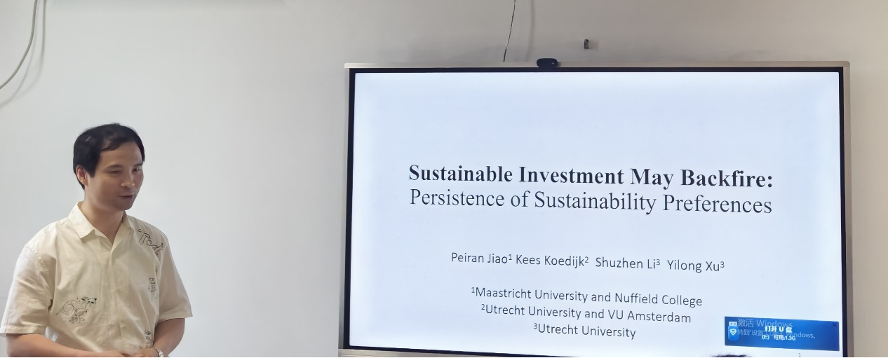 马斯特里赫特大学Peiran Jiao教授作了题为《Sustainable Investment May Backfire: Persistence of Sustainability Preferences》的学术报告,通过实验经济学方法探究了负收益经历对投资者对可持续基金与传统基金的投资偏好影响。研究采用2×2组间实验设计,比较了消费者在仅接受描述性信息和拥有模拟账户投资体验时,在有无明确的可持续项目基金标识两类情景下,对美国大盘股可持续基金与传统基金的投资选择。研究发现:(1)即使可持续基金明确产生环境效益,投资者仍不愿接受较低回报;(2)模拟账户体验显著降低了初始对可持续基金的配置比例,并促使投资策略趋于稳定;(3)尽管投资者随时间推移减少可持续投资配置,但其可持续偏好并未改变,这种调整主要反映了风险与收益的权衡而非可持续性考量。该研究为理解ESG投资行为的驱动因素提供了新证据,表明财务考量仍是投资决策的首要因素,而可持续偏好则表现出较强的稳定性特征。