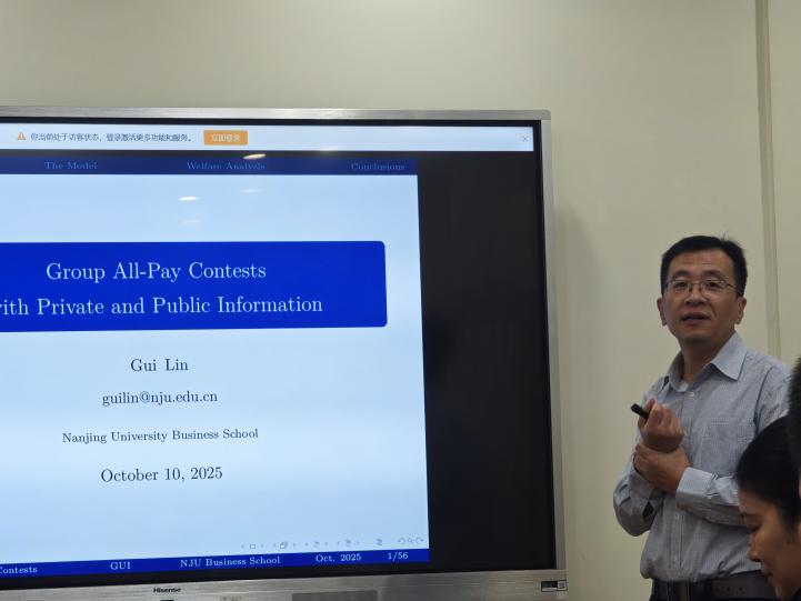本次讲座为解析群体竞赛中信息结构与策略协调的复杂互动提供了严谨的理论模型,为不完全信息博弈、组织协调等内容注入了新的分析视角。桂教授的精彩报告在现场引发了热烈、深入的讨论,在场师生对桂教授的倾情分享表示衷心感谢。