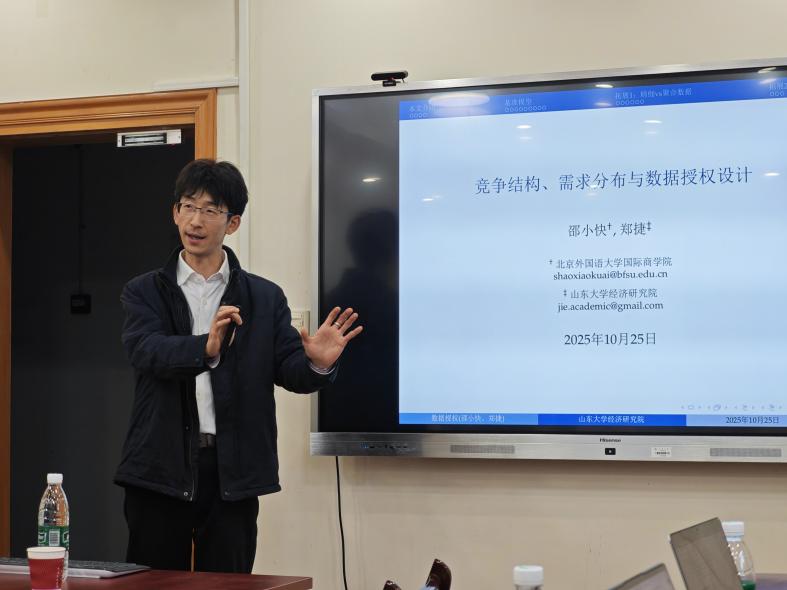 北京外国语大学邵小快教授作了题为“竞争结构、需求分布与数据授权设计”的报告。邵教授指出当前我国数据要素市场初探阶段,明晰数据交易中的所有权、使用权、排他性和转让条件在数据确权问题中备受关注。邵教授考察了一家拥有用户数据的数据商,向两家存在潜在竞争关系的厂商转让数据过程的最优授权模式。厂商间对称或不对称的信息结构决定了双方间转售数据的动机,因此数据商的授权策略应明确排他性并区分数据使用权和所有权。研究结果表明:(1)对于策略互补式的竞争结构(如Hotelling),对双方产品持有同质性偏好的用户致使数据独占厂商更有动机向竞争对手转售数据以缓解竞争压力,此时数据商应全部授权给所有厂商,或授予独家所有权并加收转售差价;而用户的异质性偏好减少数据转售动机,独家使用权或所有权均为最优模式。(2)对于策略替代式的竞争结构(如Cournot),上述结论正好相反。(3)无论首次授权还是转售,提供对用户分类更详细的“精细数据”其价值高于模糊化处理后的“聚合数据”。