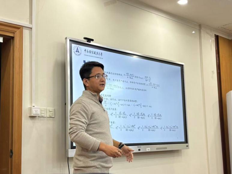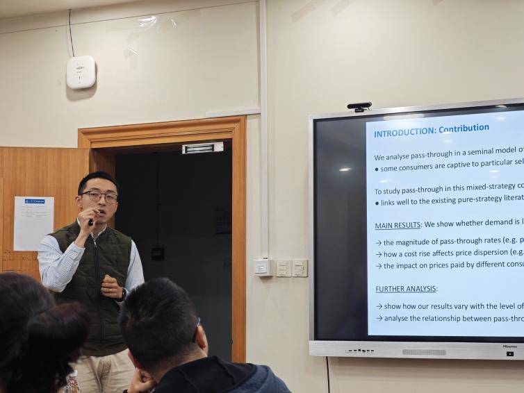 李若辰副教授作了题为“Understanding Cost Pass-Through when Prices are Dispersed”的报告。目前,关于价格分散市场中的成本传导机制,学界尚缺乏充分的理论阐释。李若辰副教授基于一般需求函数,在一个开创性的价格分散模型(Varian, 1980)中分析了成本变动的影响——该模型假设部分消费者被特定卖家锁定,而其他消费者则不会。为研究这一混合策略情境下的成本传导,李若辰副教授采用了一种与纯策略设定下成本传导文献紧密衔接的新方法。研究显示,在全行业成本上升后,不同类型消费者面临的价格上涨幅度,以及其对价格分散的整体影响,均取决于广泛需求函数所具有的对数凹性或对数凸性特征。此外,李若辰副教授还检验了成本上升的负担是否会更多地由被锁定的消费者或非锁定消费者承担,并揭示研究结论如何随竞争程度而变化,以及价格分散条件下成本传导与需求冲击之间的内在关联。