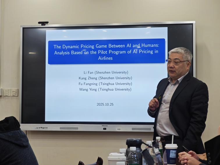 研讨会上,清华大学王勇教授与傅芳宁博士生作了题为《AI与人工的动态定价博弈:理论分析与田野实验》的报告。研究构建了一个具有容量约束和需求学习下的双期机票定价博弈模型,以探讨AI算法定价的经济使用情景。模型设定两个参与方:具有学习能力的人工定价方与具有精准预测能力的AI定价方。其中,人工方在首期对机票需求存在系统性负向偏差,并在第二期根据学习因子进行修正;而AI方则能够准确评估需求与库存的影子价值。博弈结果显示:人工方在首期倾向于过度降价,提前消耗库存,从而削弱了第二期的提价空间,导致整体收益下降;随着需求学习能力提升,双方在第二期的价格差异呈单调收敛趋势。进一步分析表明:若需求学习由首期价差内生决定且AI方无法预判该机制,则第二期价差不受首期价差扩大的影响;若AI方预判人工方的学习能力,则其将在首期设定更小的价差,并在第二期设定更大的价差,限制人工方学习能力的收益改善。傅博士还基于某航空公司的田野实验数据,对比了同一航线上AI定价航班与人工定价航班的表现。估计结果显示,相较于人工定价,AI定价显著提升了收益率与座位利用率,且其价格动态路径与理论模型预测较为一致。