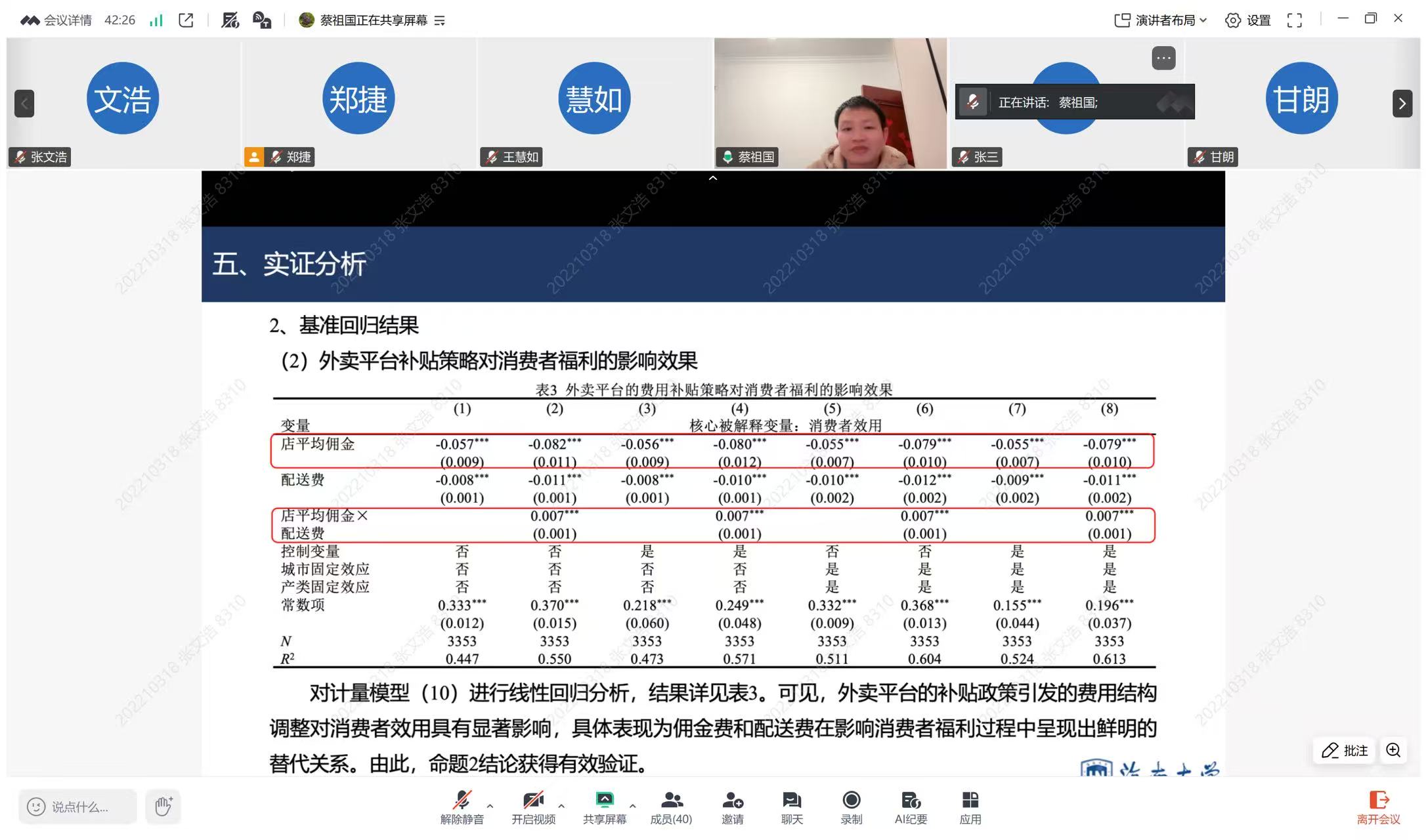 蔡教授指出当前中国的数字平台正处于高速发展阶段,平台定价策略不仅影响自身利润,也深刻关系到社会福利与市场公平。如何通过合理定价与科学补贴共同促进平台健康、可持续的发展,成为现阶段亟需解决的重要问题。蔡教授结合平台价格歧视与消费者效用理论,构建数字平台优化定价策略的两阶段理论模型,探究数字平台用佣金收入补贴消费者的交叉补贴行为对消费者福利与平台利润的影响机制;并结合国内大型外卖平台的产业实践数据,探讨数字平台交叉补贴行为如何实现三方共赢。研究发现:平台佣金与补贴之间存在战略性替代关系。当数字平台征收佣金费用而无补贴时,虽提升平台利润,但会抑制商户入驻意愿,显著损害社会总福利;而数字平台实施交叉补贴则可刺激更多消费者参与到平台市场中,在双边网络外部性的作用下,有效缓解征收佣金所带来的社会福利损失。不仅如此,当消费者价格敏感程度较高时,交叉补贴带来的费用免征更有利于数字平台实现利润最大化目标。并且,在产业实践中,消费者福利变化将受到市场竞争程度、商品种类以及质量感知的因素影响。
