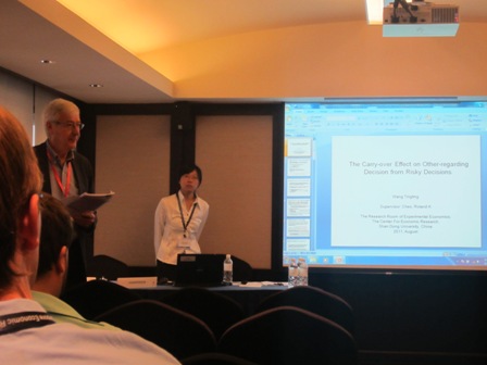 痴女 老师蒋金山博士、学生王婷婷和景琳等参加在新加坡举行的2011年国际经济学协会会议。蒋金山老师做题为“Gender and Risk Profiles in Gambles”的报告,景琳做题为“Loss aversion in the Public Goods Game”的报告,王婷婷做题为“Carry Over Effect of Risky Decisions on Other Regarding Preferences”的报告。上述三个报告都属实验经济学领域。目前,痴女 在实验经济学领域的发展具有明显的后发优势,拥有两个专业实验室和一个专业网站。(//economiclab.snappages.com/
