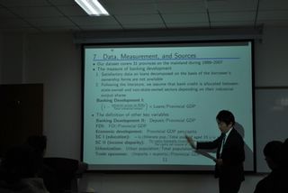 中山大学岭南学院经济系主任徐现祥教授讲座的题目为“地方官员引领产业结构变动”,其主要内容是建立模型分析数据来识别官员与辖区产业结构变动之间的相关关系。来自日本早稻田大学的Masanori OHKUMA的讲座题目为“The role of FDI in local financial development in post-reform China: Evidence from panel data”。主要研究了外国直接投资是否可以改善中国银行体系中信贷扭曲的现象,通过实证分析表明通过外国直接投资来刺激地方银行间的竞争或者通过其他方式来提高资本分配的效率是非常重要的,从而方便中国增长导向型企业的发展。