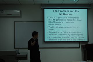 在此次的讲座中,徐军博士的报告主要分为两个部分。首先介绍了估算市场风险(Beta)的新方法。他指出,由于市场的不完美性,股票价格,尤其是那些小企业的股票价格并不能与市场同步运动,结果从市场模型中估计的当期Beta值造成对小企业的低估以及对大企业的高估。通过对大量文献的回顾,徐军博士指出了当前存在的问题并提出了一个新的模型(a model of delay/lead price reactions for small/large firms),并详细讲解了该模型的假设、估计方法及实证结果。在第二部分中,徐博士介绍了以新估计Beta为基础的资本资产定价模型的检验。检验结果表明,新Beta比OLS Beta和SW Beta在论证假说方面表现的更好。