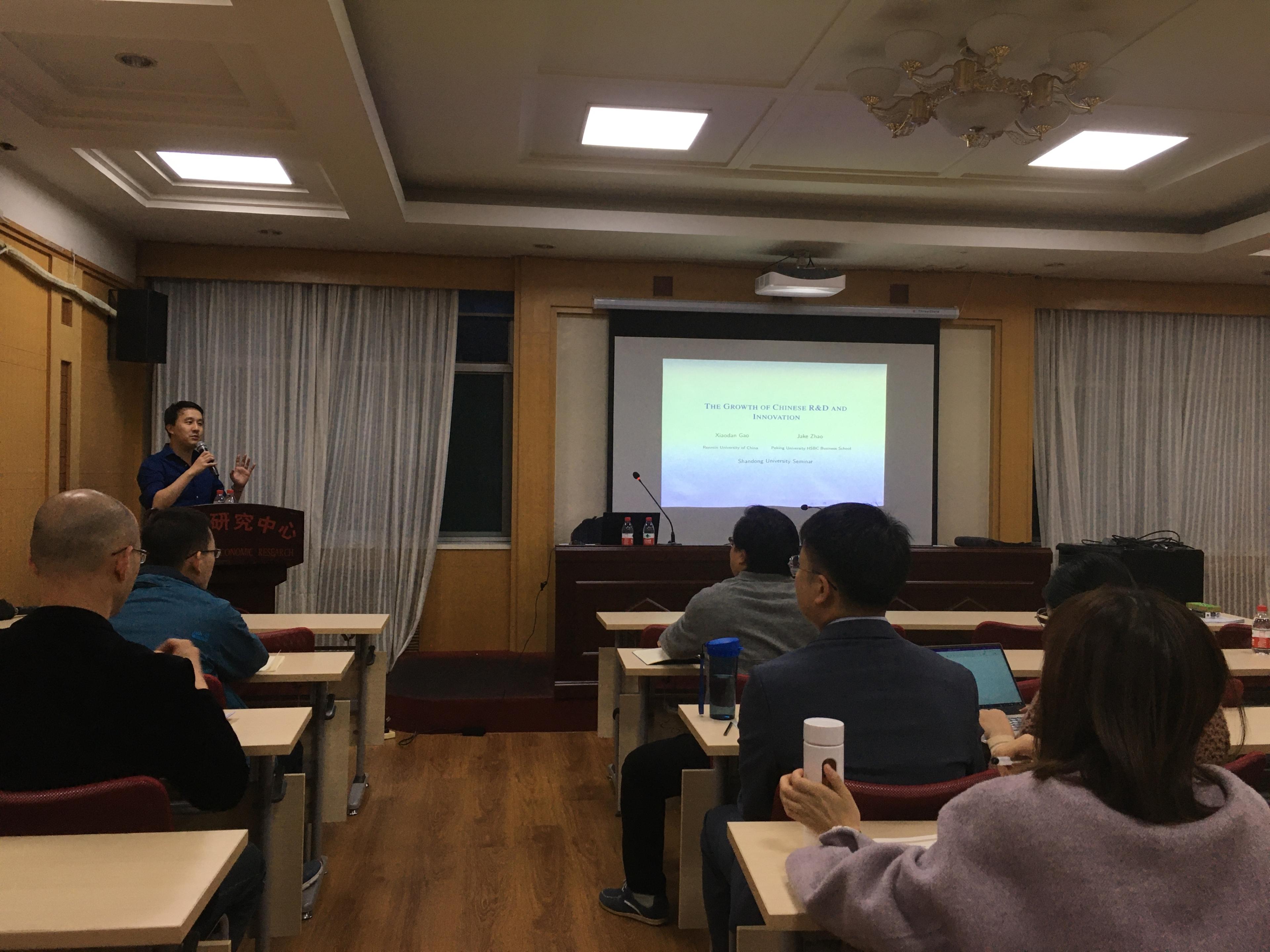 在过去40年里,中国的国内生产总值以惊人的速度增长,但是它的研发总支出却增长得更快。作者构建了一个使研发和生产率内生增长的企业动态模型,为了更加切合中国国情,该研究在经典模型基础上做了相应的改进和假设,将中国数据带入模型进行模拟检验,并与实际情况对比后发现:从2008年起,大量的研发补贴增加了研发支出,在没有政府激励的情况下,研发支出占GDP的百分比应该会趋于平稳。此外,外国技术溢出效应对经济增长至关重要,尤其是在中国改革开放初期,如果没有外国技术外溢,中国企业的生产率将落后10多年。最后,该研究评估了各种研发政策的有效性,并认为对生产率较低的企业给予更多的研发补贴更有效,而对研发支出较低的企业给予更多的补贴则不那么有效。学院师生就数据的来源,创新补贴的类型等问题和Jake Zhao进行了讨论。