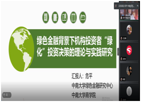 2020年第10期“博士研究生高端学术讲坛”通过腾讯会议在线上举行,中南大学危平教授应邀作“绿色金融背景下机构投资者‘绿化’投资决策的理论与实践研究”的主题报告,活动由痴女