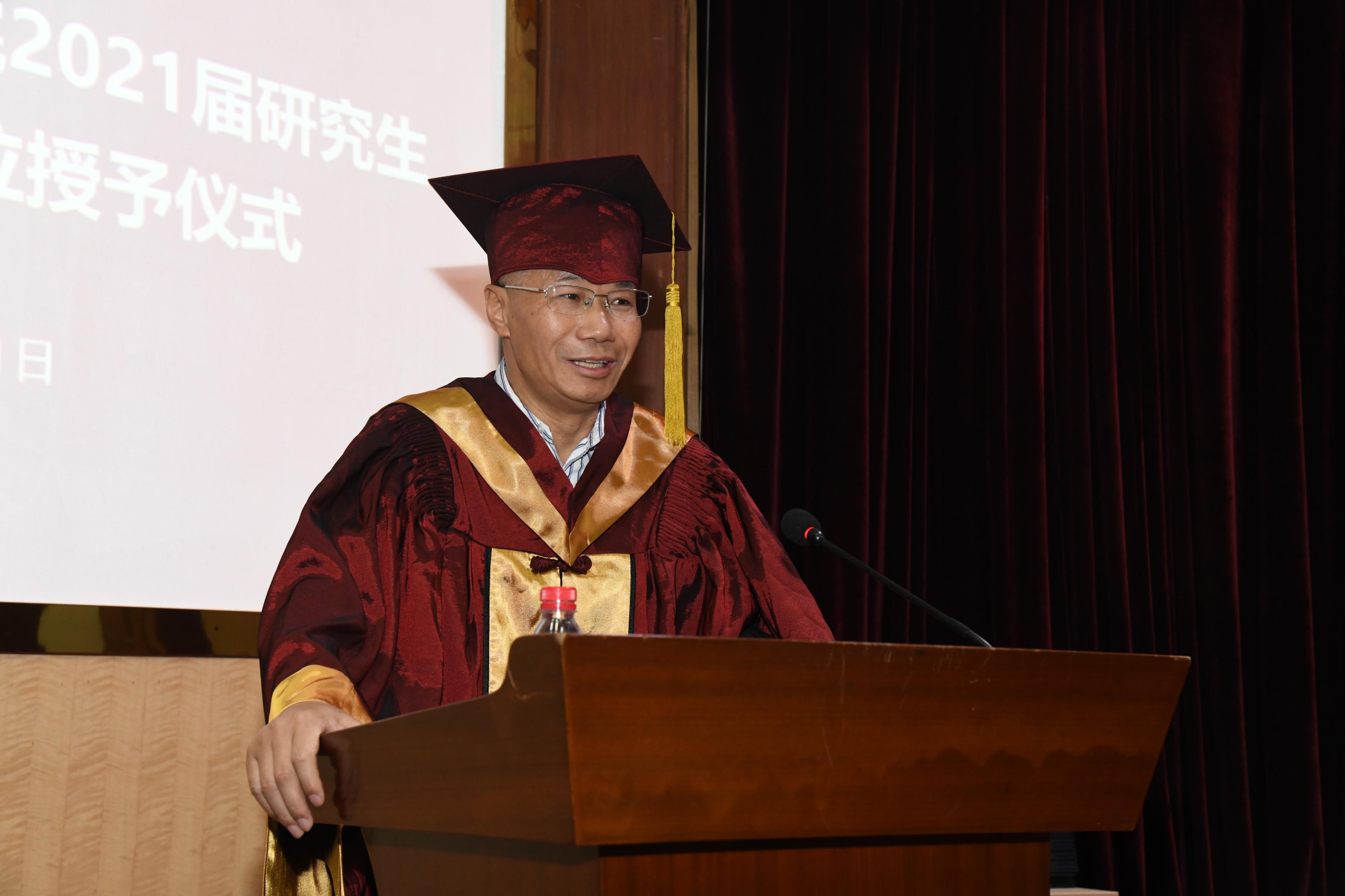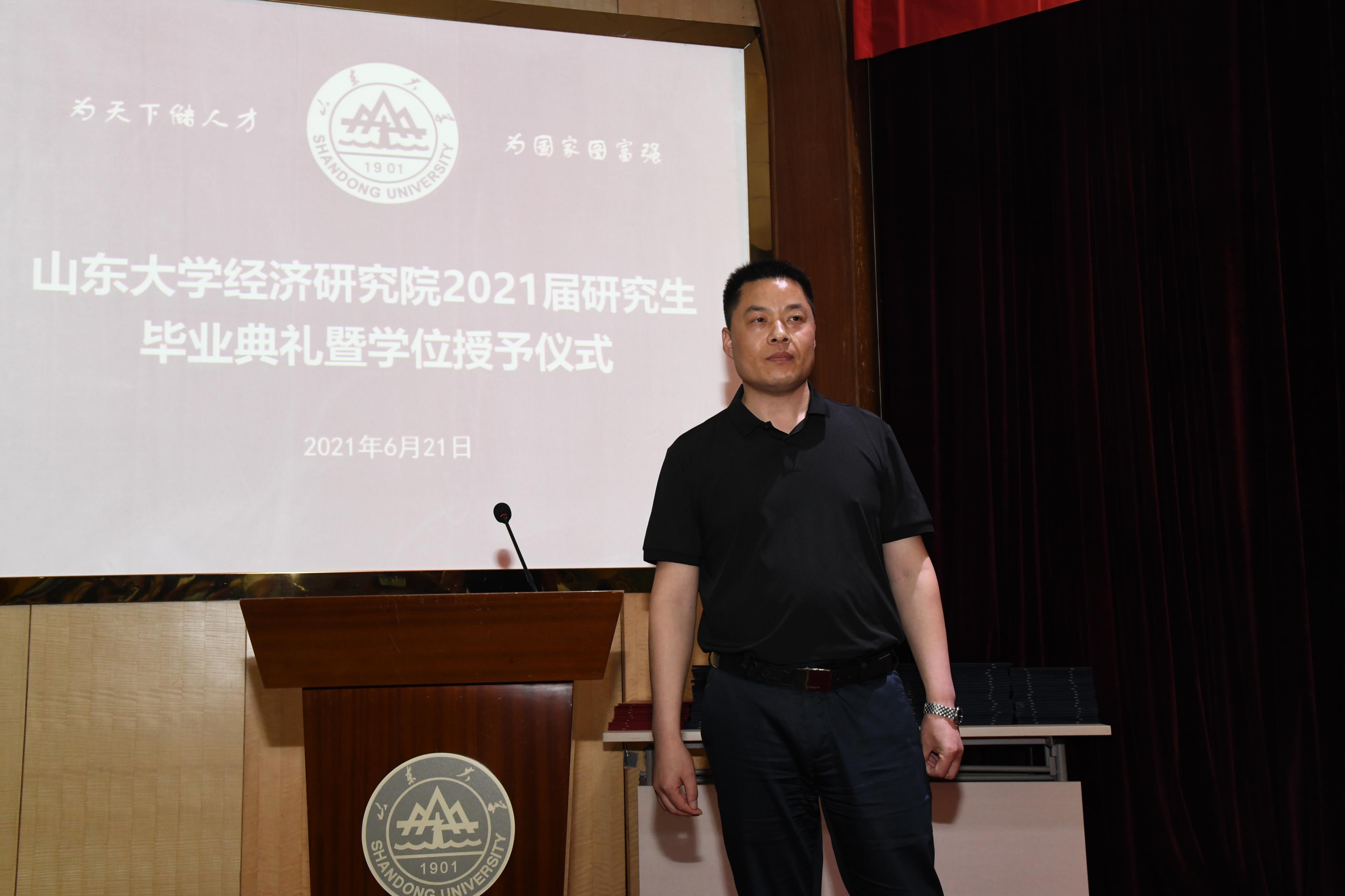 院长黄少安教授致辞。黄少安院长回顾了自己学习和工作历程中的点点滴滴,通过自己成长的故事,勉励大家不负韶华、虚心学习、开阔视野、心系家国,寄语毕业生同学:“人各有志,人贵有志,做好人生规划”,在不同的岗位上都要保持志向,发扬经研人的风骨,在建党一百周年之际,继续砥砺前行,为国家和社会做出贡献;“守住底线,放飞上线”,保持底线思维,不断取得新的上线突破,开创新的辉煌;“少一点功利主义,多一点家国情怀”,将个人命运熔铸到国家和时代发展历程中去。