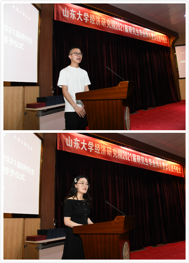 之后,毕业生代表2018级硕士张汝彬、2018级博士李亚飞分别发言,他们回顾了在经研院收获的知识与智慧、同窗情谊和生活经验,在学院的悉心培养下,提升学术涵养,聆听大师课程,思考经济问题。同时,感谢疫情期间老师和同学们的默默坚守、家长的支持。他们表示,作为经研院发展历程的见证者与创造者,在中华民族伟大复兴的历史征程中必将承担经邦济世,经世济民的历史责任,将成熟感、幸福感、获得感延续下去,永远心存经研、心系学院,心有家国、在未来工作、学习、科研中不断努力奋进。