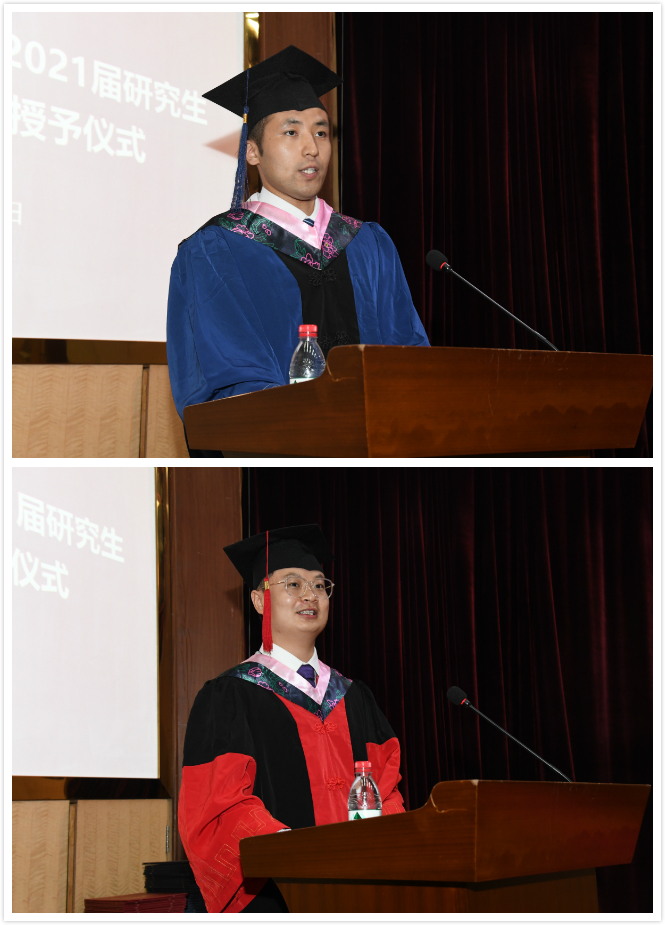 随后,在校研究生代表致辞,2020级硕士焦银亿感谢学长学姐在生活学习上的帮助,他们悉心的答疑解惑与课后辅导使自己又找到学习动力,学院优良的学风和大家刻苦的学习精神使他耳濡目染,经研人的优良品格使他倍感奋进。2018级博士刘晓红回顾了她与同窗成长的点滴,感谢学院提供了宝贵的学术平台以及大家在日常生活、科研工作等诸多方面的帮助,表达了对毕业生同学们的深切祝福和依依惜别之情,表示全体在校生必将以优秀毕业生为榜样,保持家国情怀,一如既往的坚守经研人“底气、霸气、灵气、正气”的本色,铸造经研院新的辉煌。