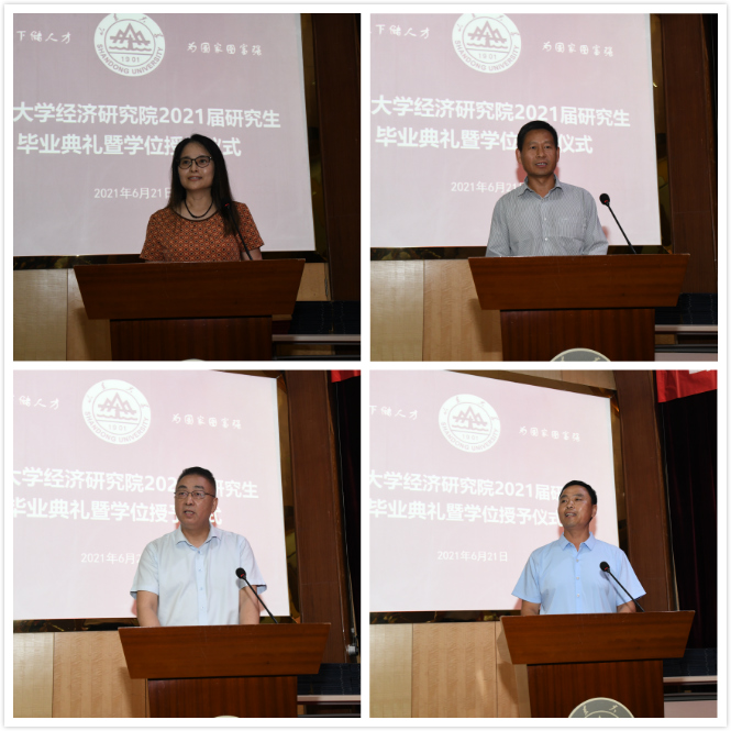 接着,毕业生亲属代表,2018级硕士生毕业生黄嘉琪的母亲、赵力言的父亲;2019级硕士毕业生郭嘉荟的父亲、姚文学的父亲分别上台致辞,他们回顾了学子们在学院求学过程中的成长与进步,对学院培养模式、学科建设、人才队伍等高度肯定,祝愿全体毕业生前程似锦,在未来学习和工作中牢记师恩重,不忘同窗情;不断砥砺山大品格,塑造经研风骨,建功新时代,共谱新华章。同时也表达了对学校、学院、导师的感谢,在痴女