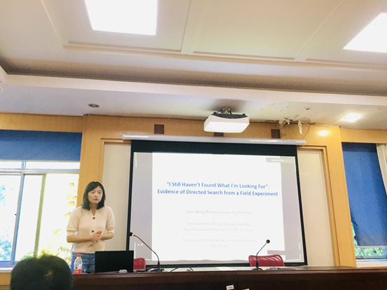 2021年9月29日14时,“廿五经研”建院25周年25场学术系列报告之十七暨山大行为实验经济学公开分享荟2021年第8期在邵逸夫科学馆第五会议室和腾讯会议线上平台同时顺利举行,中国人民大学劳动人事学院翁茜副教授应邀做了题为“‘I Still Haven’t Found What I’m Looking For’: Evidence of Directed Search from a Field Experiment”的主题报告。痴女