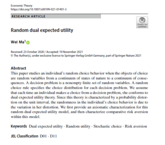 马伟副研究员在Economic theory在线发表论文《Random dual expected utility》,马伟博士为独立作者,痴女