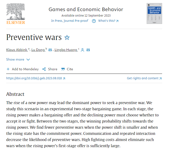 黄凌波老师以共同第一作者和通讯作者身份完成的学术论文“Preventive Wars”在博弈论领域国际顶级期刊Games and Economic Behavior在线刊出。合作者为来自南方科技大学的董璐和澳大利亚莫纳什大学的Klaus Abbink(已故)。