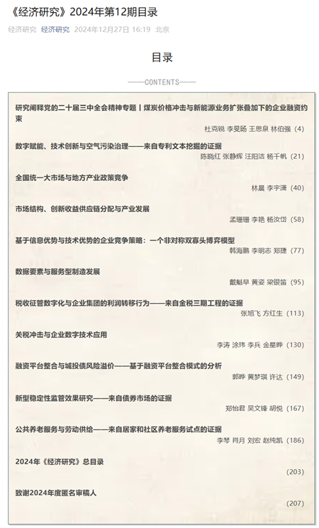 郑捷教授与清华大学经济管理学院的李明志副教授和博士生韩海鹏同学合作的成果“基于信息优势与技术优势的企业竞争策略:一个非对称双寡头博弈模型”发表于《经济研究》2024年第12期,这是郑捷教授团队在数字经济与行为科学领域的又一重要研究成果,也是郑捷教授2024年发表的第四份A类成果(之前的两份英文工作分别于7月和11月发表于博弈论顶刊Games and Economic Behavior,另一份中文工作于2月发表于《经济研究》)。《经济研究》是中国经济学领域的顶级期刊,代表了中国经济学研究的最高水平,1955年创刊,由中国社会科学院主管、中国社会科学院经济研究所主办。