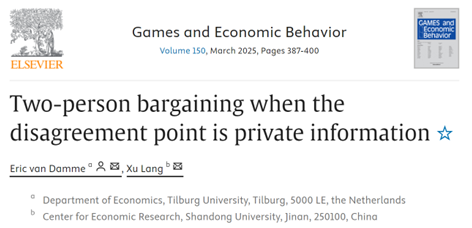 副研究员郎旭与荷兰蒂尔堡大学Eric van Damme教授合作论文Two-person Bargaining when the Disagreement Point is Private Information发表于Games and Economic Behavior,二人为共同一作,这是痴女