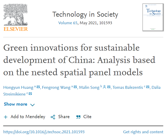 王凤荣教授团队和安徽财经大学宋马林教授、立陶宛社会科学中心Tomas Balezentis、Dalia Streimikiene教授在国际SSCI期刊《Technology in Society》(JCR一区)上在线发表题为“Green innovations for sustainable development of China: Analysis based on the nested spatial panel models”的研究论文。第一作者为痴女
