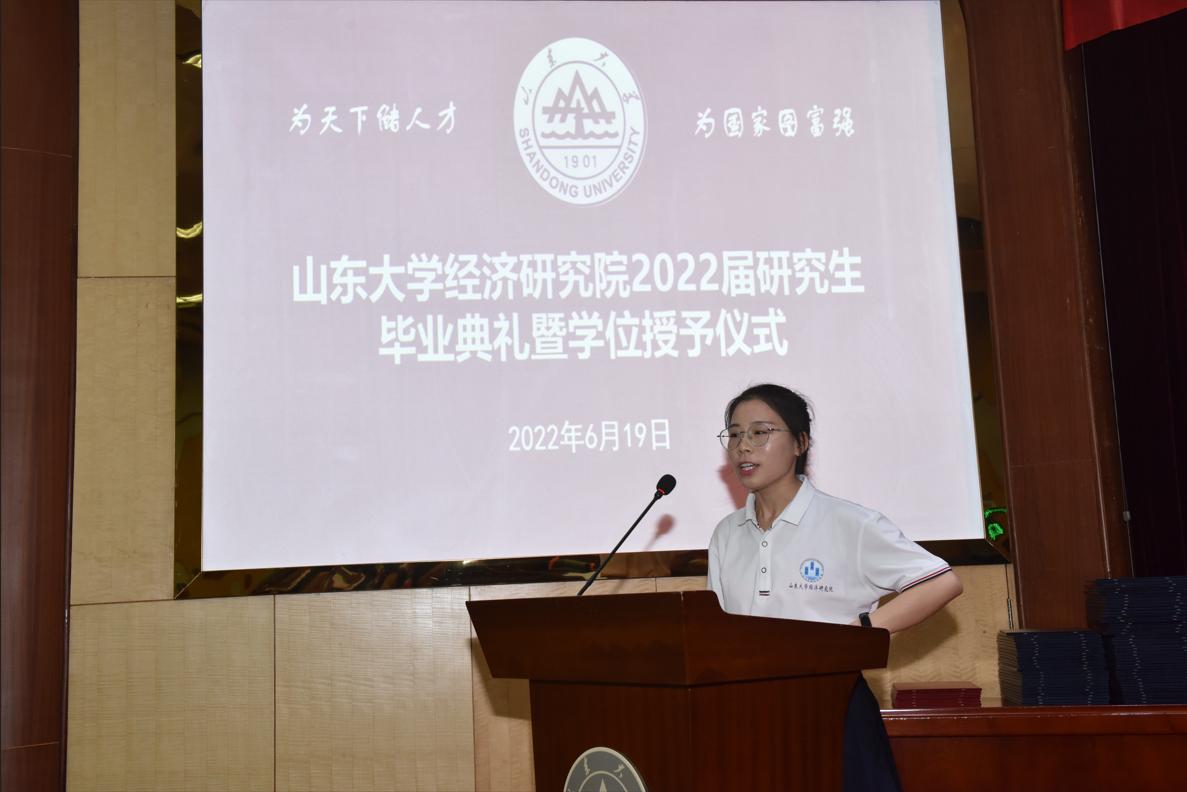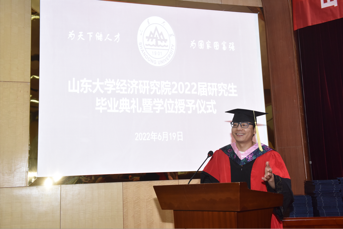 随后,在校研究生代表致辞。2021级硕士李加红感谢师兄师姐在生活学习上的帮助,他们悉心的答疑解惑与课后辅导使自己又找到学习动力,并祝愿学长学姐们山高路远,风光无限。2021级博士张荣杰感谢学院提供了宝贵的学术平台以及在日常生活、科研工作等诸多方面的帮助。并提及在研究生生涯中,大小事件不断交汇,从见证者到参与者的转变过程中,离不开国家与社会的支持,离不开山大经研院老师们的培养,离不开家长的支持,鼓励大家将个人命运投入到国家、社会的发展需要中去。