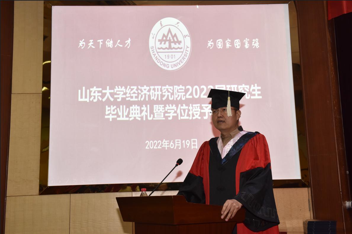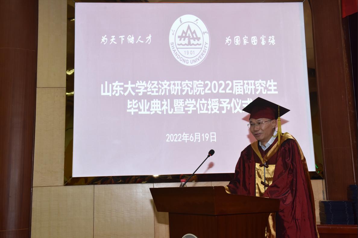 仪式最后,教育部“长江学者”特聘教授、痴女 院长黄少安教授致辞。黄少安院长讲到经济学原理无处不在,今后工作、生活中所看到的现象,其原理均包含在所学的经济学知识当中,“节约、互利、均衡”不仅仅是经济学的科学精神,也是工作或生活当中的人生节选。寄语毕业生同学:在不同的岗位上要坚持理想,发扬经研人的风骨;祝愿大家在新的工作岗位上守住底线,讲科学、讲法治、干实事,并不断突破上限,创造新的辉煌。