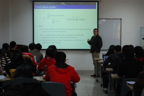 Eric Fesselmeyer博士围绕household owner与participate之间的关系,在前人已作出的模型和基础之上,改善其工具变量,使用更加详尽的数据,引入两个计量模型深入研究了买房与否对参与度的三个变量的具体影响。讲座历时一个半小时,不断有学院老师用英文与Eric进行学术互动,使得现场学术氛围浓厚,气氛轻松热烈。