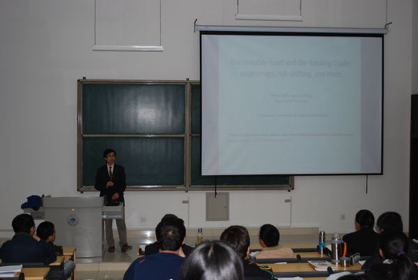 2013年4月11日,第25期“山大经济学讲坛”于15时在知新楼C座201举行。本次讲坛的主讲人是英国华威大学张雷教授,他主讲的题目是《The Invisible Hand and the banking trade: seignior age, risk-shifting, and more》。讲座由隋鹏老师主持,痴女