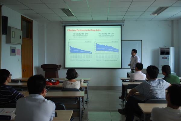 李善军博士主要研究环境经济学和产业组织。他在讲座一开始通过对比30年代美国的环境危机和当前中国面临的环境问题,简要介绍了环境经济学的重要性和他对环境经济学长远发展的展望。之后李善军博士介绍了发达国家绿色财政刺激政策的政策背景,并主要介绍了汽车以旧换新政策。由于旧车造成的污染更严重,因此汽车以旧换新政策不但能够刺激经济的发展(汽车的消费)还能起到保护环境的效果。接着,李善军博士提到Tinbergen's rule :政策工具不能少于政策目标。