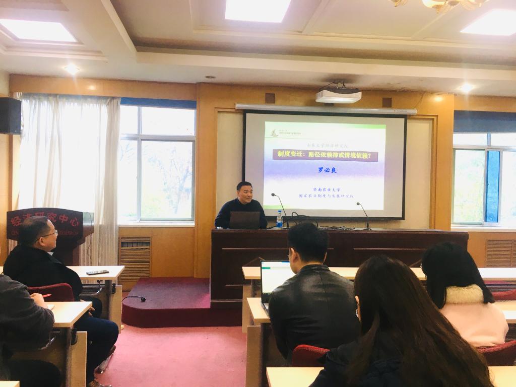 2019年第8期“山大经济学讲坛”在中心校区邵逸夫科学馆第五会议室顺利开讲,华南农业大学国家农业制度与发展研究院院长罗必良教授应邀作“制度变迁:路径依赖抑或情境依赖?”的主题报告,活动由痴女