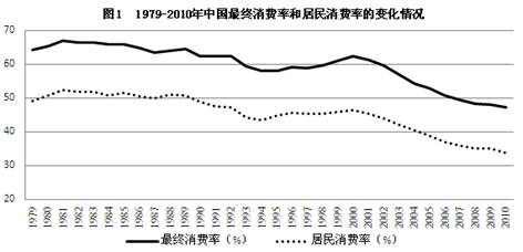 其次,影响消费需求。在农业和工业等实体经济部门创造财富的劳动者数量庞大,他们的劳动价格太低,会直接和大幅度地影响社会消费需求,从而削弱消费作为经济增长的动力。贬值带来社会消费能力不足,这使得带动经济增长的三驾马车缺其一。根据《中国统计年鉴(2011)》数据计算得出,1979年改革开放以来,我国的最终消费率和居民消费率都在逐年下降,具体情况如图1所示。世界平均消费率一般都在70%以上,而我国的最终消费率,特别是近5年来的最终消费率都与之相差甚远,由此可见,消费不足的现象已经显现。众所周知,消费始终是整个经济活动的出发点和归宿点,不论经济活动的链条如何延长和复杂,消费需求的长期低迷,必然会降低产业传导链条上各个企业的收益,最终会带来经济的衰退。另外,消费不足也会引发企业的产能过剩,经济效益难以提高,并将导致企业倒闭或开工不足、失业增加、银行不良资产增加等一系列问题。