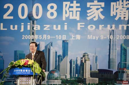 Zhou Xiaochuan, governor of the People's Bank of China, addresses the Lujiazui Forum 2008 in Shanghai, east China, May 10, 2008. Heads of the People's Bank of China, the country's central bank, the Securities Regulatory Commission, the Banking Regulatory Commission and the Insurance Regulatory Commission all attended the two-day financial forum, opened on May 9. Lujiazui is the name of Shanghai's financial district. (Xinhua Photo)