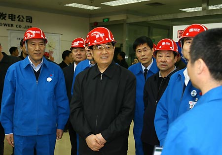 Chinese President Hu Jintao (C) talks with a worker as he inspected a power company of north China's Inner Mongolia Autonomous Region, Nov. 19, 2007. (Xinhua Photo)