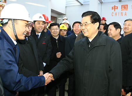 Chinese President Hu Jintao (right, front) shakes hands with a worker as he inspected a plant of China Shenhua Energy Co., Ltd in Ordos of north China's Inner Mongolia Autonomous Regioin, Nov. 17, 2007. (Xinhua Photo)